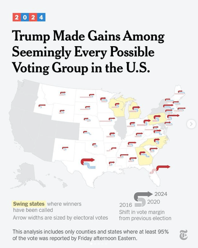 Another post from November 8 highlighted swing-state voting patterns from 2016, 2020, and 2024. Through a series of arrows, the infographic revealed how Trump made gains across demographics, even in areas where he ultimately lost.