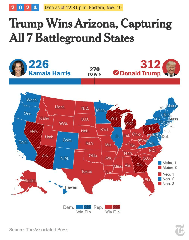 The accompanying message summarized the results: Donald Trump secured 312 electoral votes and claimed every single one of this year’s battleground states. The simplicity of this map made a monumental political outcome digestible for everyday viewers.