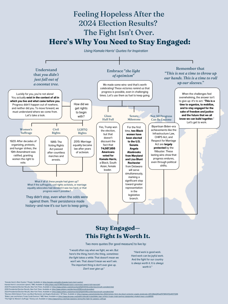 Description: Using data to guide the design, I created an infographic that re-energizes disheartened Democrats and emphasizes the importance of continued engagement. The project delivers a hopeful message paired with actionable steps to encourage advocacy and civic participation.